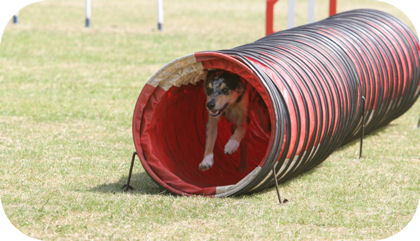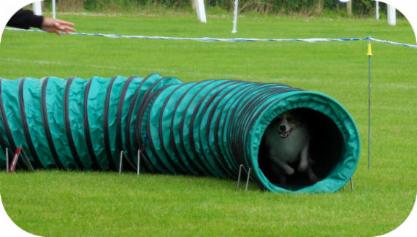 There are two types of tunnels in agility courses - pipe (or rigid) tunnels and flat (or cloth) tunnels. Dogs are taught to to pick up the entry to a tunnel from a distance so you do not need to run right up to each tunnel entrance! Dogs also need to learn to be confident enough to push themselves through a cloth tunnel which can be quite scary for some dogs. It is useful for dogs to be trained to be called off the obvious entry to a pipe tunnel and to be sent into the other, less obvious, entry.