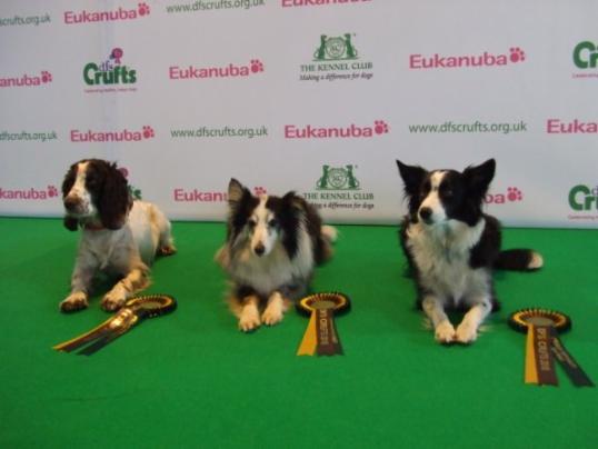 L-R Rogue, Merlin and Jess with the rosettes they won at Crufts