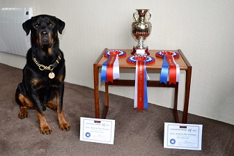 Lisa and Andy had this to say about their win . . . "Chico looking proud of his haul from the Baddogz Awards! He won Best Large Dog, Best Grade One Dog and best of all was voted joint Dog of the Year by fellow Baddogz members. Think it is great that a Rottweiler can be so well-loved at an Agility club, we are very proud of the positive way Chico represents the TRUE nature of his breed, not the unfairly stereotyped image you read about in the tabloids. Well done Chicster!"