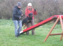One obstacle that was holding Chico back was the seesaw. That's not uncommon, its quite a technical task for dogs to accomplish correctly. But, strangely, his A-frame and dog walk contacts were excellent - why the problem with seesaw? It was quite strange to see our otherwise completely fearless Rottweiler jump nervously off barely halfway along the plank. He didn't understand the movement of the seesaw - why does it move when the other contacts are solid? So what was the solution? With nothing more complicated than a lot of time and patience, Chico slowly learned that the end of the seesaw contact was a magical place where vast quantities of high quality chicken, liver and sausage could be found! The seesaw is now his favourite piece of equipment, and he now bashes over it with such power that I'm pretty sure we're going to owe Trudy a new seesaw soon!