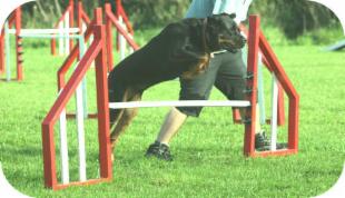 One other aspect of Chico's welfare that we needed to address in that first year or so was his weight. Rottweilers really like their grub, and can carry a lot of extra weight without it being especially noticeable. Trudy very tactfully pointed out that it would benefit Chico's agility if he could lose a few pounds as otherwise he would never be able to do more than "small" height. We took Trudy's advice to heart and we gradually reduced his food intake. He has gone from a peak of 45kg to a currently normal weight of 33kg! As Trudy pointed out once, that 12 kg difference is actually slightly more than her Merlin weighed when she got him ...and needed a diet too!! ...so initially Chico was doing agility whilst virtually carrying a Merlin around with him! This really illustrates how doing agility helps to improve the all round welfare of dogs, and being overweight can cause no end of health problems for your dog.