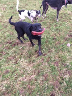 We went out walking at the weekend, we managed to dodge the rain. We go walking to a field and then we play frisbee, we normally go in the field near our house but it had cows in there! Bella wants to herd them! We had to walk past another field with cows and there was a BIG bull. Nero barked and barked at him but the Bull didn’t care at all he carried on eating his grass. We went in a different field and played Frisbee and running in the mud, even Harvey greyhound ran about and usually he just stands and watches. I made everybody laugh – I’m not sure what was funny but I had the Frisbee in my mouth and everybody kept laughing at me! It made me very happy! Bella got brown, she was splattered all over her whiteness! She got taken upstairs when we got home, I didn’t, I got taken outside and hosed down. Nero doesn’t like the hose, he’s scared but we don’t know why.