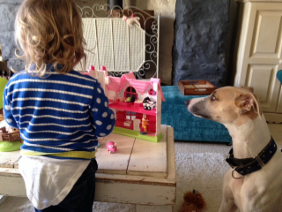 Okay back to my story I keep barking up the wrong tree. My little lady actually belongs to a human called Jenna, she is two years old so I'm told, and very small compared to the other humans. She runs around a lot and really likes food so we have those things in common. She can be very bossy and calls me hossy, no hossy, sit hossy, come hossy, stay hossy, down, but when she is not being bossy we have great games together, we play dolls house, writing, cooking, cup of tea time, I have to drink water from a dolly Cup , I really like to do that, but my favourite game is run with me, my mum always seems to be watching us, very carefully and will tell the little lady to be gentle or to calm down and when I want to go back to my bedroom she says, now leave him alone he needs a rest. And little lady says night night Hossy.