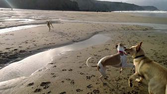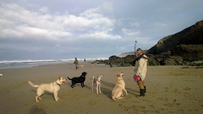 What a busy week I have had, meeting friends old and new. Starting last weekend and a wonderful day on Crantock beach. Now I love this beach, more than I can say, I can run and run and run. We met up with my friend Annie, who is a labradoodle , she has two humans Yvonne and Graham, I like Yvonne a lot ,she strokes me and says I am a handsome lad. But best of all she carries treats, of which she sneaks me one and thinks my mum isn't looking.
