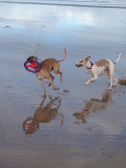 Torking of zoomies.. I went to the beech wiv my fwend Ozz today (yoo can reed about him on this page) hee is a whippet too, but I fink he woz fitted wiv reely fast legs wen he woz wiv his doggy mum, cos he went a teeny bit faster than mee.. but I got the frizbee and that’s all that matters.. I hav to say that I woz a bit tired, but I wont tell ozz that, cos he mite BOL at me so I just pwetended that mummy WANTED to hav me on her nee wiv my hed over her showlder..